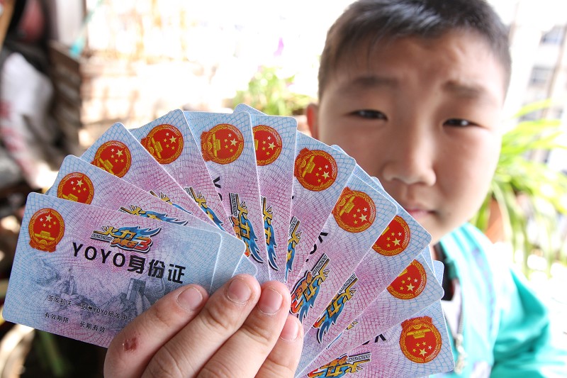 十月十八日,一小学生展示在校边小店掏钱兑奖的游戏卡片。这些卡片设计外表像公民第二代身份证,正面印着“YOYO身份证”,国徽、长城,反面印着姓名、性别、民族、出生、住址、身份证号等字样。这样的“身份证”在学校周围叫卖抽奖,已构成违法。家长呼吁,要加强管理,给孩子一个游玩的好环境。(本报记者杨闻名摄)