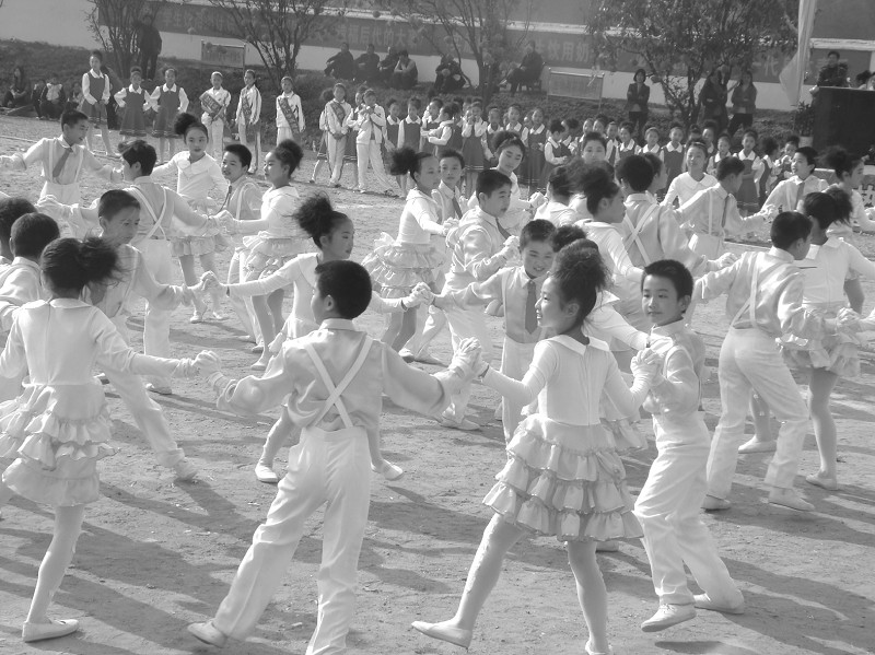 时而悠扬、时而欢快的歌声,时而飞扬、时而抒情的舞蹈,整齐划一的广播体操,小小的表演者们,尽情地歌唱着。女生们头发上的丝带在微风中轻舞飞扬,平日里的野小子们在衬衣和领结的装扮下,活脱脱一个小绅士。歌在唱,舞在跳……