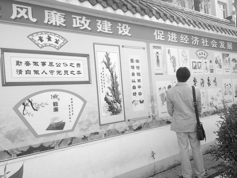 随县殷店镇政府大院内,有一道独特的“风景”,那就是廉政文化墙。文化墙上用诗歌、格言、书画、漫画等多种形式来宣传反腐倡廉,特别是书画和漫画新颖生动,引人注目。