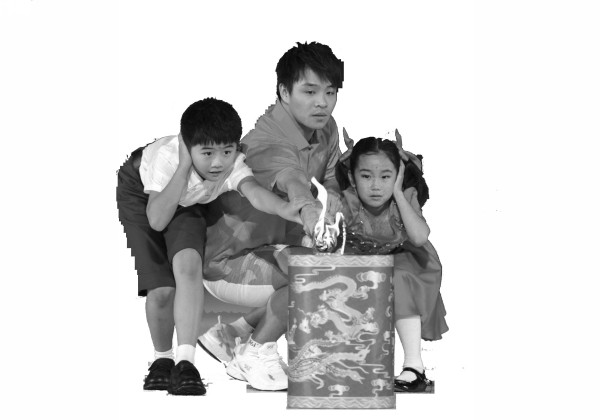 (中)与儿童熊钰翔(左)、陈佳雨一起点燃引燃主火炬的中国传统炮竹。