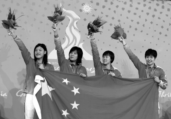 11月14日,广州亚运会女子4X100米自由泳接力决赛举行,中国队夺得冠军。图为中国队队员唐奕、朱倩蔚、王施佳、李哲思在领奖台上。 (新华社发)