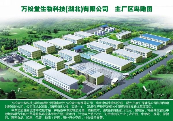 万松堂生物科技(湖北)有限公司是由武汉万松堂生物医药公司、北京中科生物研究所、随州市康汇保健品公司共同组建的股份制公司,公司在随县开发区征地100亩,新建科研大楼、实验中心、GMP生产线开发相关中草药超临界流体萃取项目。