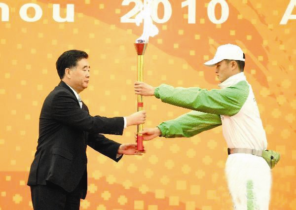 图为12月4日,中共中央政治局委员、广东省委书记汪洋(左)接过点火火炬。当日,2010年广州亚残运会火炬点燃暨火炬传递活动启动仪式在北京举行。