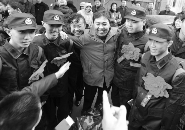 12月16日,出生于1993年的济南四胞胎兄弟孙长宇、孙长峰、孙长岭、孙长涛奔赴军营开始军旅生活。图为即将奔赴军营的四胞胎兄弟和父母合影留念。(新华社发)