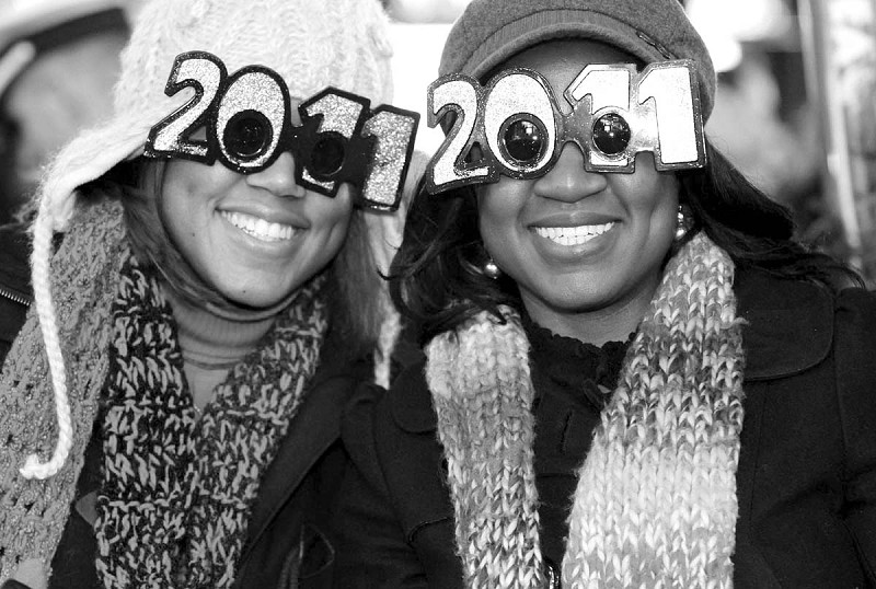 2010年12月31日,人们戴着2011年字样的眼镜在美国纽约时报广场参加新年欢庆活动。 (新华社发)