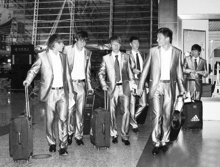 2010年12月31日凌晨,国足坐着飞机去多哈了,据说为了展示新局座新掌门执掌下的新国足的新风貌,足协给国脚一人一身新西装,银光闪闪,颇有点像龙鳞,有点暗合巨龙的意思。银装素裹下的国脚们在初着西装时还觉得挺别扭。现在全民织围脖,郜林在第一时间在其围脖里展示了他的西装照,粉儿们都说他像新郎。新郎新气象,新国足能否给人新气象呢?