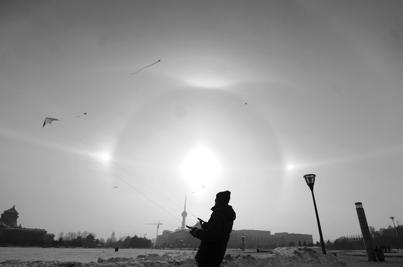1月8日,一名游客在放飞风筝。当日,长春天空出现“幻日”。“幻日”属于大气的一种光学折射现象,由于冬季云层比较高且云层是由冰晶组成的,经过偶然的排列形成一种特殊形状的反射体。 (新华社发)