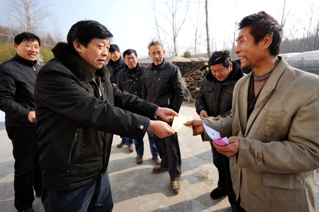 1月7日,市药品食品监督管理局负责人来到随县厉山镇狮子口村,走访慰问贫困户,向该村送去1万元扶贫款,并向计生困难户每户送去500元慰问金。 (本报记者 李文军摄)