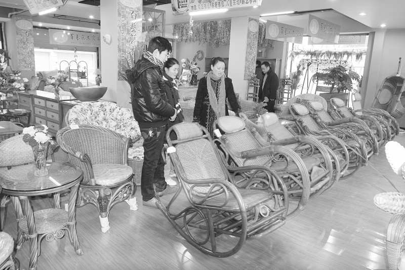 1月8日,城区香港街太子楼民众乐园里,市民在百艺藤木家具店挑选藤木家具。该店在随州落户以来,时尚古典、健康环保的各类工艺藤木编织家具热销,成为老百姓首选的绿色家具。 (本报记者 杨闻名摄)