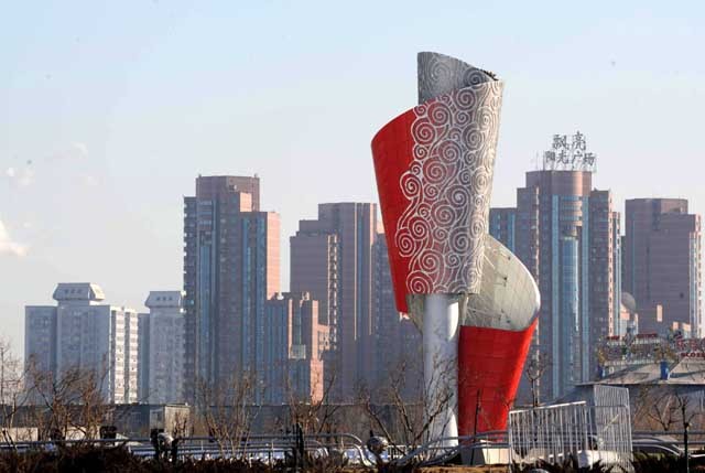 1月16日,重新亮相的火炬塔与周边的建筑相映成趣。日前,完成“搬家”移建施工的北京奥运会主火炬塔在“鸟巢”东北角的火炬广场重新亮相,在造型上与北京奥运会开幕式火炬点燃时的状态一致。 (新华社发)