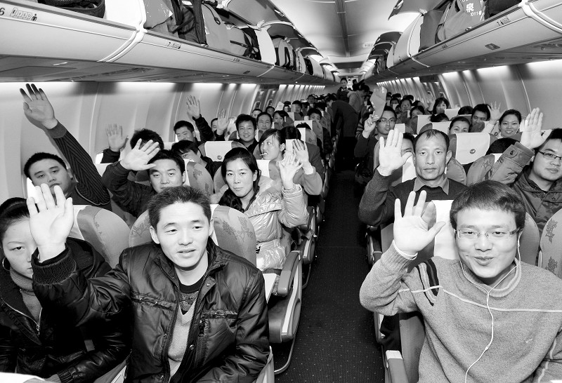 1月27日,近50名四川籍外来务工人员搭乘厦航MF8447航班从泉州机场顺利踏上归乡之旅。据了解,2011年春运期间,泉州市工会组织通过“包专车、包专机、包专列”三包活动,帮助农民工返乡。 (新华社发)