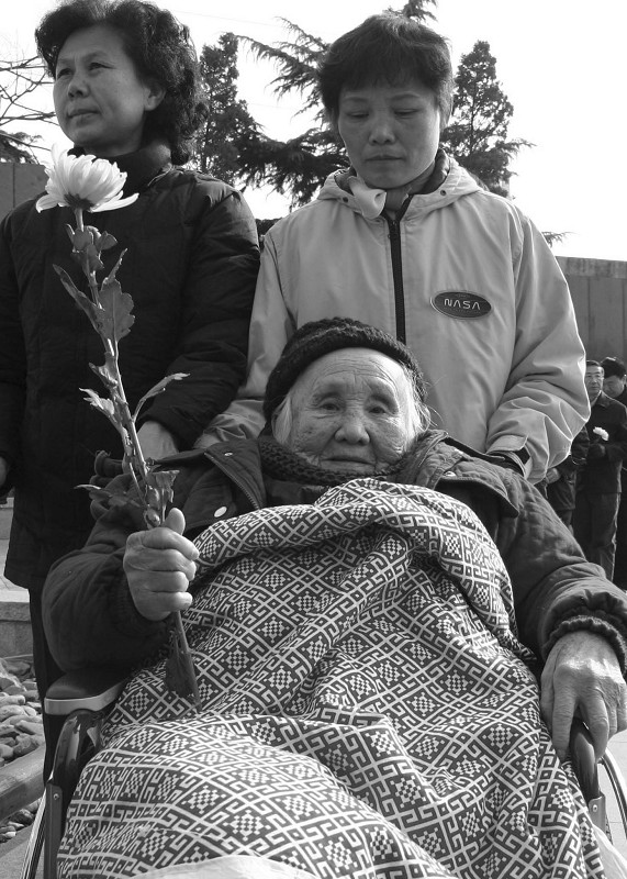 右图:2005年12月13日,吴秀兰老人在侵华日军南京大屠杀遇难同胞纪念馆向大屠杀遇难同胞献花。