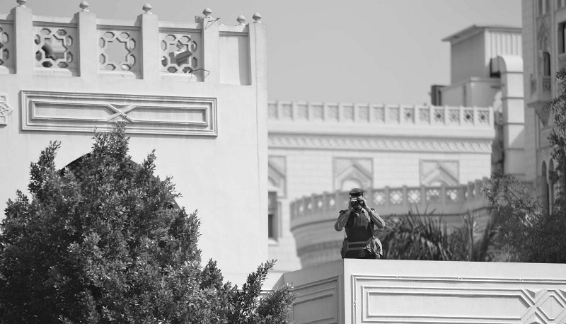 2月11日,士兵在埃及首都开罗的总统府内警戒。埃及军方当日发表声明,表示支持总统穆巴拉克关于政权和平过渡的计划,保证穆巴拉克在电视讲话中提到的各项承诺得到执行。