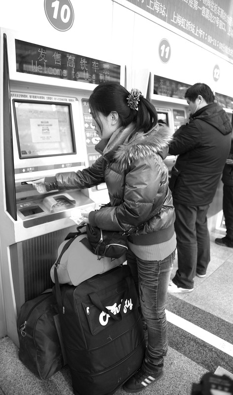 图为:3月8日,旅客在上海火车站自助售票机前购买高铁车票。