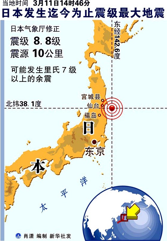 新华社3月11日电 日本东北部地区11日下午发生里氏8.8级强烈地震,引发大规模海啸,造成重大损失。