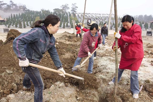 3月13日,曾都南郊办事处瓜园公墓管理处组织工作人员在墓区开展义务植树活动。 (本报记者 杨闻名摄)