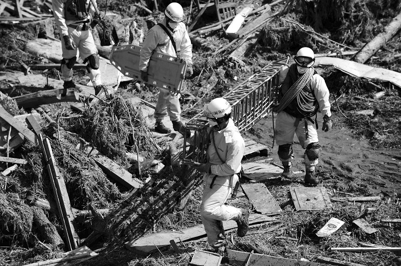 3月13日,救援队员在日本宫城县仙台市若林区三本冢一带搜救。