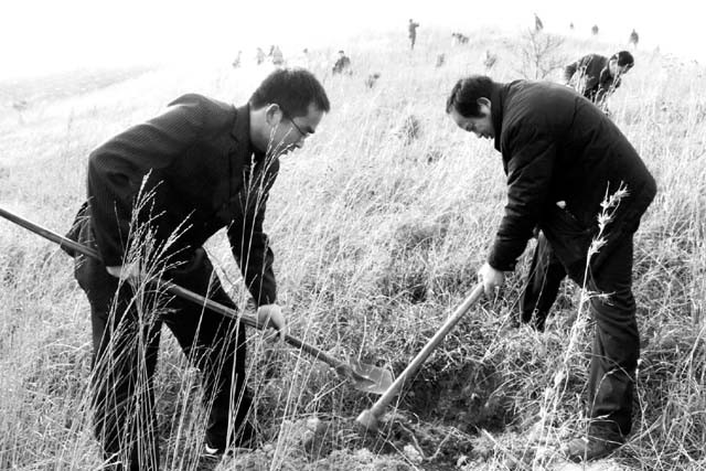 日前,随县殷店镇组织干部群众进行义务植树活动,仅三月十二日当天,就有一千五百亩荒山“披”上了新绿。(陈俊凤 熊欣 摄)