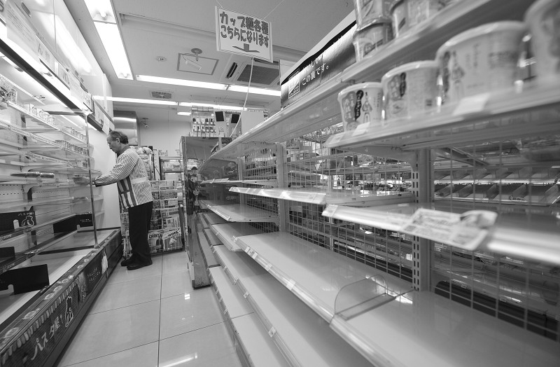 图为:3月17日,日本东京涩谷区一个便利店的速食食品货架上空空如也。受地震影响,东京许多商店的速食类食品被抢购一空。(新华社发)