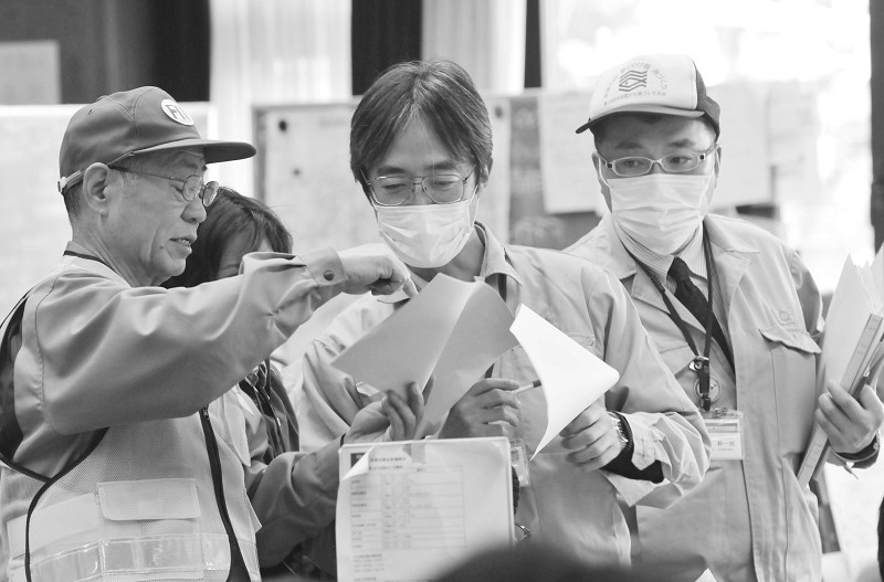 3月19日,在日本福岛市灾害对策本部,几名专家正在商议。日本福岛发生核电站泄漏事故后,政府迅速在福岛县福岛市成立灾害对策本部,包括核能安全专家、消防及应急队伍等数百名专家聚集于此,全力对付核泄漏危机。 新华社发
