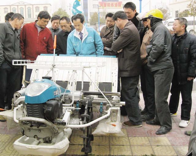 三月二十四日,随州经济开发区淅河镇农机服务中心农机技术培训及产品推介会现场,吸引了众多农村科技示范户、种田大户、农机操作手前来咨询、观摩。当场有五十多位农民签订意向购买插秧机和收割机的合同。(本报记者 杨闻名 通讯员 向以涛 摄)