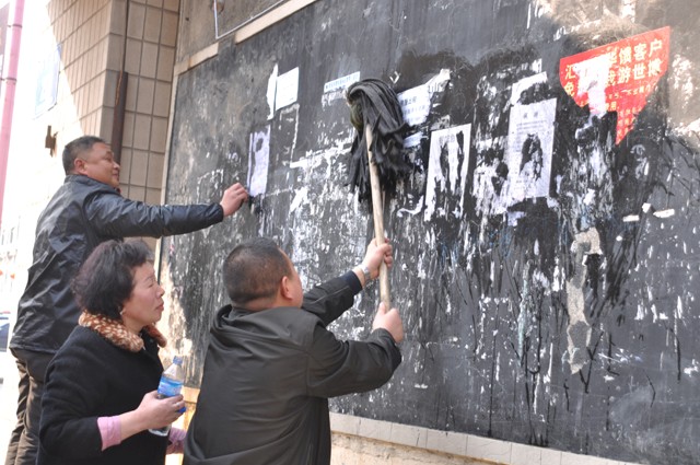 图一:连日来,曾都区东城办事处组织各社区居民对辖区范围内的环境进行整治,为清洁随州城做贡献。图为舜井社区正在清洗街头“牛皮癣”。(本报记者 陈德友 通讯员 健康 立馗 摄)