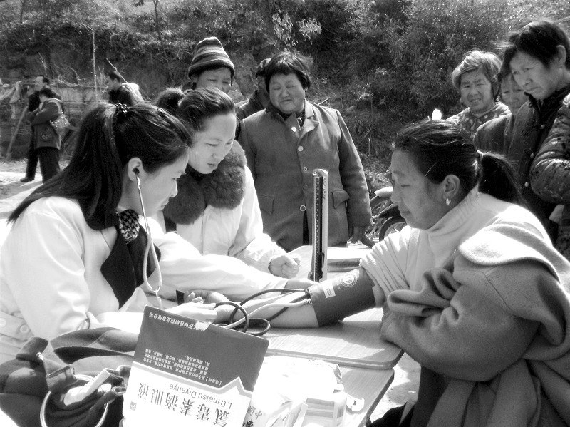 广水市二医院结合“万名干部进万村入万户”活动到乡镇农家,广泛开展送医送药送健康活动,为老百姓办实事,让农民得实惠。图为该院组织医疗骨干为中华山林场莲花村群众义诊的情景。 (程晓斌 摄)