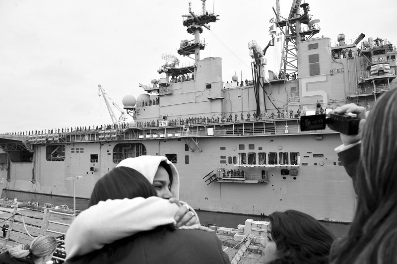 3月23日,在美国弗吉尼亚州诺福克海军基地,亲人们目送“巴丹岛”号两栖攻击舰离港。当天,美国海军派出由“巴丹岛”号两栖攻击舰、“弗德台地”号两栖船坞运输舰与“惠德比岛”号船坞登陆舰组成的两栖作战舰队,携舰载战斗机、海军陆战队和医疗设施前往地中海参与针对利比亚的军事行动。 (新华社发)