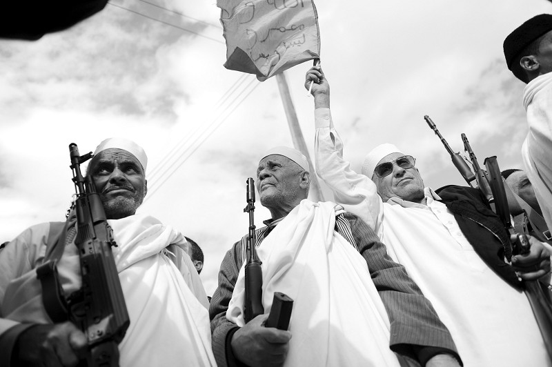 3月23日,在利比亚贝尼沃利德,卡扎菲的支持者们参加示威游行。利比亚首都的黎波里当地时间23日晚遭到西方战机袭击,导致平民伤亡。阿尔及利亚、加纳、意大利等国呼吁和平解决利比亚危机。 (新华社发)
