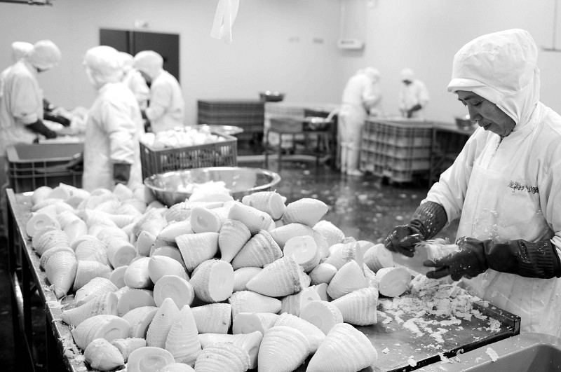 浙江衢州市龙游外贸笋厂工人在处理水笋。自日本大地震后,浙江部分蔬菜加工企业来自日本的订单翻倍,各企业加紧生产各类蔬菜制品,驰援日本地震灾区。 (新华社发)