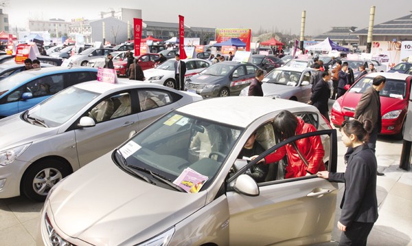 3月26日,一辆辆崭新的奇瑞、雪佛兰、本田等小车汇聚在市博物馆广场前展销,引来我市城乡不少的市民前来购车。 (本报记者 杨闻名摄)