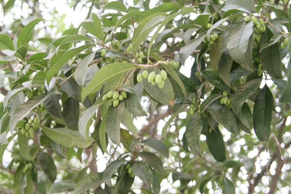 记者在曾都区卫生局大院看到结果的桂花树。树有4米多高,茂密的叶子下竟然隐藏着簇簇绿莹莹的桂子。几乎每根树枝上都结了好几簇,每一簇有几个至十几颗桂子,果实为不规则的纺锤形,酸枣般大小,为青绿色,经测量长约1.3厘米左右,一簇簇的拥在一起,煞是可爱。据工作人员介绍,这6棵桂花树有20多年树龄,桂花结果还是第一次见到。