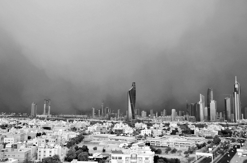 3月25日,科威特首都科威特城被强沙尘笼罩。科威特石油集团25日说,由于受当天下午突然来袭的强沙尘天气的影响,科威特石油集团暂停所有原油开采和出口工作。科威特国际机场也因沙尘天气暂时关闭。