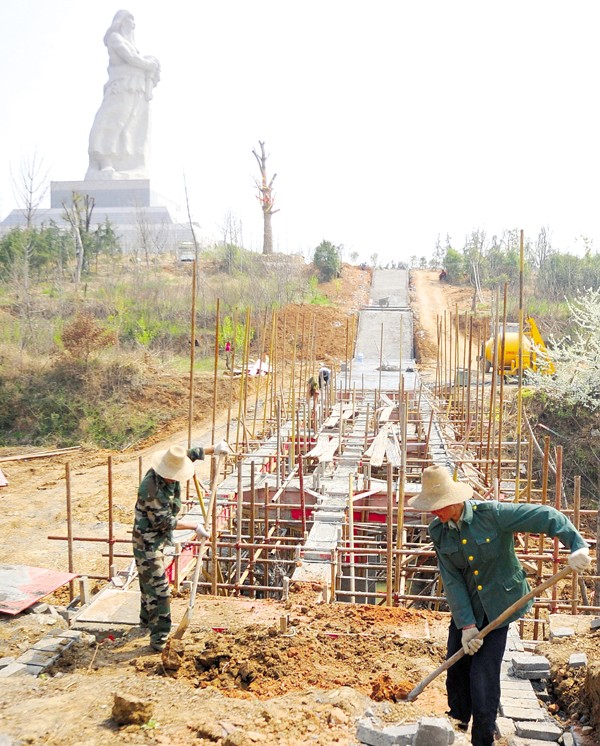 炎帝神农故里风景区加紧完善景区配套建设,以迎接辛卯年寻根节。3月30日,工人正在修建炎帝神农大殿通往炎帝大像的木栈桥和通道,建成后两地距离可缩短一半。 (本报记者 李文军摄)