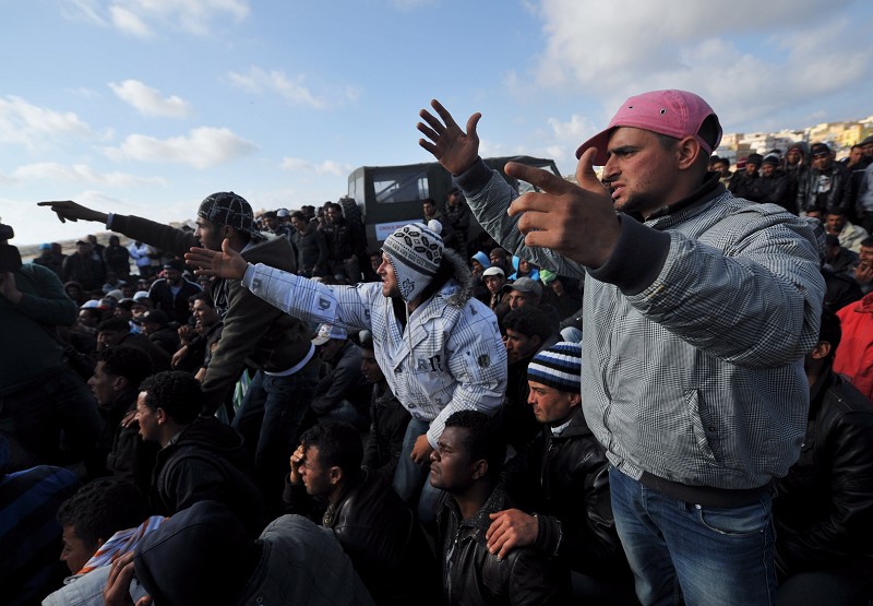 3月31日,在意大利最南端的兰佩杜萨岛,大批北非移民在港口集聚抗议。3月以来,已有超过3300名来自兰佩杜萨的非法移民来到距法国仅10公里的温蒂米利亚地区试图越境,法方加强边境检查进行拦截。目前意法两国因北非移民危机关系紧张。 (新华社发)