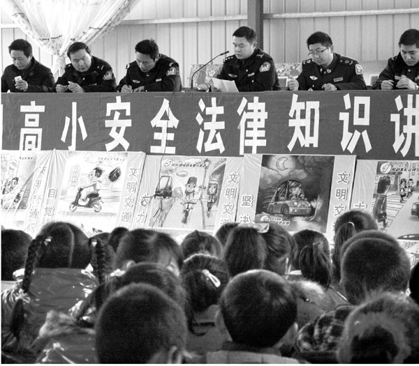 3月28日,公安民警在曾都区洛阳镇高小向学生讲解交通安全知识。当日是第16个全国中小学生安全教育日,公安民警们走进洛阳镇中小学给师生上了一堂安全知识课。 (本报记者 杨闻名 通讯员 蔡奎川摄)