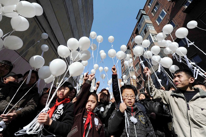 4月4日,群众准备放飞白色气球。当日,哈尔滨市道里区安静街道办事处下辖七个社区的百余名群众进行清明祭奠革命先烈活动,居民们通过集体默哀和放飞气球等文明低碳的方式缅怀革命先烈。 (新华社发)