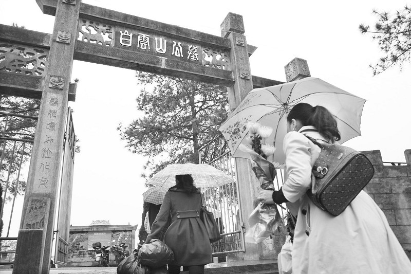 4月2日,下雨又降温,一些市民手捧鲜花,冒雨前往白云山公墓扫墓。