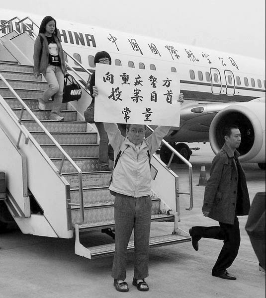常量是7日乘坐CA4354号航班到达重庆江北国际机场的。走下飞机舷梯时,他举着写有向重庆警方投案字样的纸牌(见左图)。