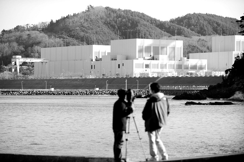 日本经济产业省原子能安全保安院8日宣布,由于7日夜的里氏7.1级余震,东北电力公司的女川核电站和东通核电站的乏燃料池在地震后曾短暂丧失冷却功能,但很快得到恢复,乏燃料池水温也几乎没有上升。图为4月5日,在日本宫城县女川町,摄像记者在拍摄女川核电站。 (新华社发)