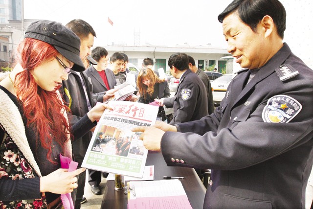 4月9日,市公安局交警支队举办“警民心连心,邀您进警营”主题活动。当日,近百名群众走进该支队参观检测站内务管理、车辆检验等工作。图为交警向群众发放宣传资料。