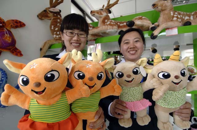4月14日,工作人员在展示为欢迎台湾赠送大陆的梅花鹿和长鬃山羊落户威海市刘公岛森林公园而专门制作的卡通布偶。2008年11月,海协会与海基会在台北举行恢复协商后的第二次会谈。海基会宣布将向大陆同胞赠送梅花鹿、长鬃山羊。2009年底,大陆有关方面确定山东威海刘公岛国家森林公园作为接收梅花鹿和长鬃山羊的地点。台湾梅花鹿“繁星”“点点”和长鬃山羊“喜羊羊”“乐羊羊”将于4月16日正式入住威海刘公岛国家森林公园。 (新华社发)