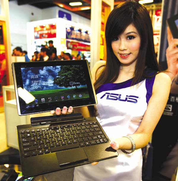 4月7日,一名工作人员在台北春季电脑展上展示刚刚上市的华硕(ASUS)EeePadTransformer型平板电脑。该机采用10.1英寸屏幕,内置Android3.0操作系统,其最大特点是在主机之外另有一个可拆卸的底座(下),主机既可以单独作为平板电脑使用,也可以插入底座而作为笔记本电脑使用。目前存储容量为16G的主机售价为14900元新台币 (约合3311元人民币),底座售价4490元新台币(约合998元人民币)。