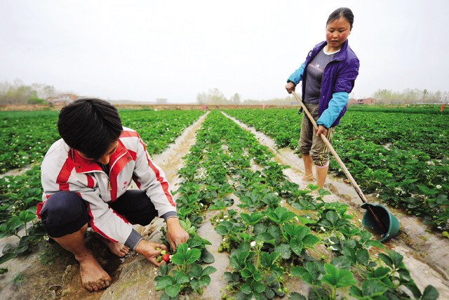随县厉山镇北岗村走特色产业之路,户户种草莓,亩均收入过万元,成为远近闻名的草莓村。4月17日,该村一组农民王世兵夫妇正在采摘草莓和为草莓补墒。今年头茬草莓每公斤卖到10元钱左右,草莓成了他们家的“摇钱草”。 (本报记者 李文军摄 通讯员 龚承斌文)