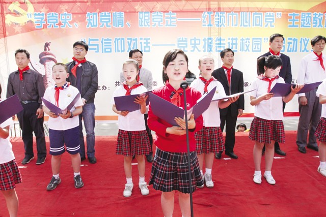 为迎接建党90周年,4月18日,湖北省“学党史、知党情、跟党走”主题教育活动暨“与信仰对话——党史报告进校园”活动启动仪式在曾都区实验小学举行。 (本报记者 杨闻名 通讯员 李莉摄)