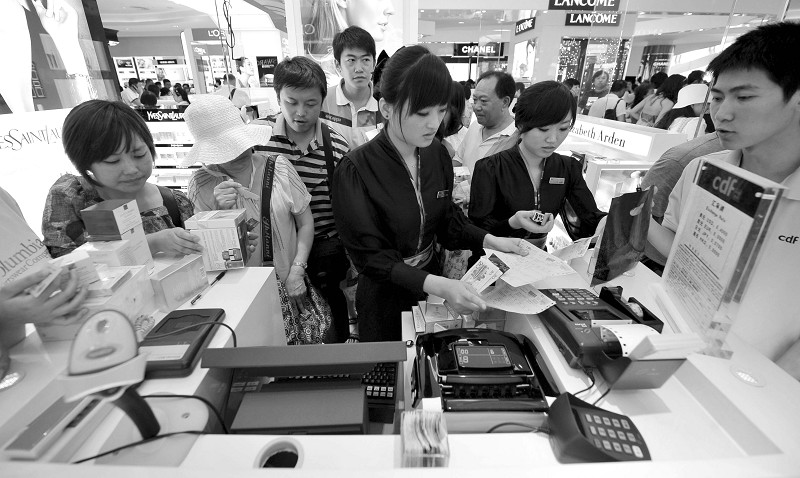 4月20日,顾客在三亚免税店内办理购物手续。当日,海南离岛旅客免税购物政策试点实施启动仪式在三亚市免税店举行。至此,海南正式成为全球第四个离岛免税区。 (新华社发)