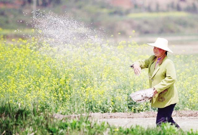 4月17日,随县均川农民正进行田间生产。金黄色的油菜花和撒向田间的肥料将田间装扮得分外美丽。 (本报记者 孙洪涛摄)