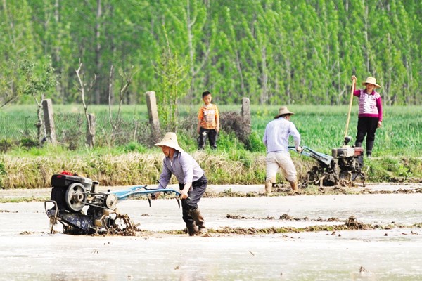 四月中下旬,我市各地农村正抢抓农时,抓紧春耕生产。图为随县安居镇肖店村农民正在耙地和平整秧床,准备育秧。(本报记者李文军摄)