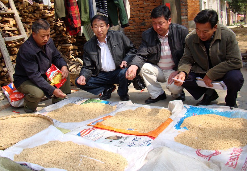 ▲市建行工作队在随县环潭镇龚家湾村讨论选择稻谷品种。 (黄敏 摄)