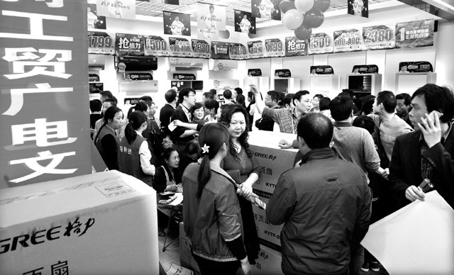 四月二十三日,随州工贸广电家电文峰旗舰店购买节能环保家电的市民络绎不绝。随着生活水平的提高,市民对家用电器的节能、环保意识增强,新购家用电器节能产品受到欢迎。据该卖场销售人员告诉记者,最近节能环保家电产品销售量比同期增幅在百分之五十以上。(本报记者 杨闻名 摄)